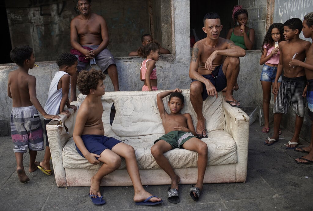 Un grupo de ocupantes irregulares espera la llegada de comida donada por una ONG en el interior de una antigua fábrica ocupada, en plena pandemia del coronavirus, en Río de Janeiro, Brasil, el 4 de marzo de 2021. (AP Foto/Silvia Izquierdo)