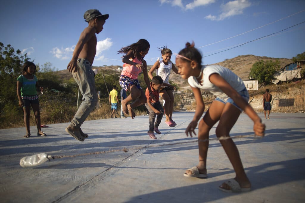 Un grupo de niños juega a saltar la cuerda en un patio próximo al vertedero de la Pavia, en Barquisimeto, Venezuela, el 3 de marzo de 2021. El enorme vertedero, donde se depositan todos los residuos sólidos de la ciudad, sirve de fuente de ingresos para los pobres, que trabajan reciclando todo lo que pueden encontrar en las enormes montañas de basura. (AP Foto/Ariana Cubillos)