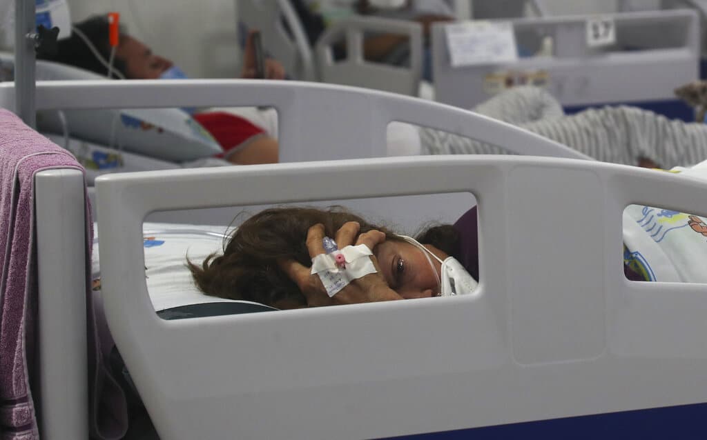 Pacientes con COVID-19 descansan en sus camas en un hospital de campaña habilitado en el interior de un recinto deportivo, en Santo Andre, a las afueras de Sao Paulo, Brasil, el 4 de marzo de 2021. (AP Foto/Andre Penner)