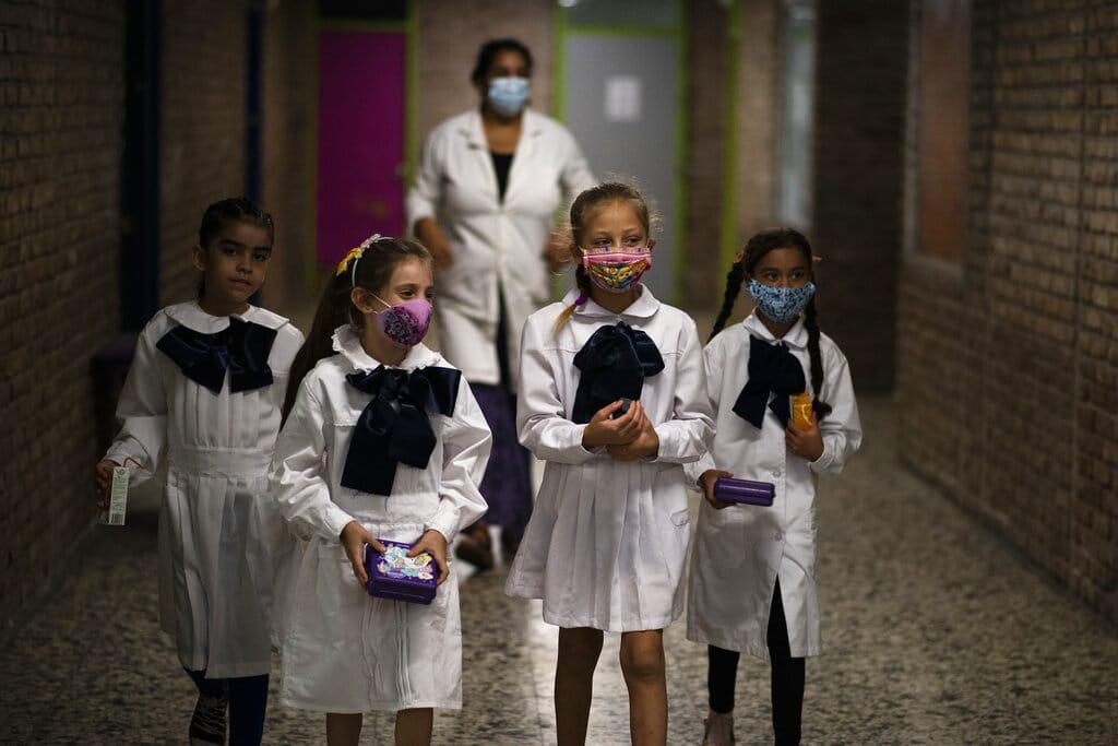 Estudiantes salen de su aula para un descanso en el primer día de clases presenciales durante la pandemia del coronavirus, en una escuela pública en Montevideo, Uruguay, el 1 de marzo de 2021. En Uruguay, la mayoría de los alumnos están retomando las clases presenciales tras las vacaciones de verano. (AP Foto/Matilde Campodonico)