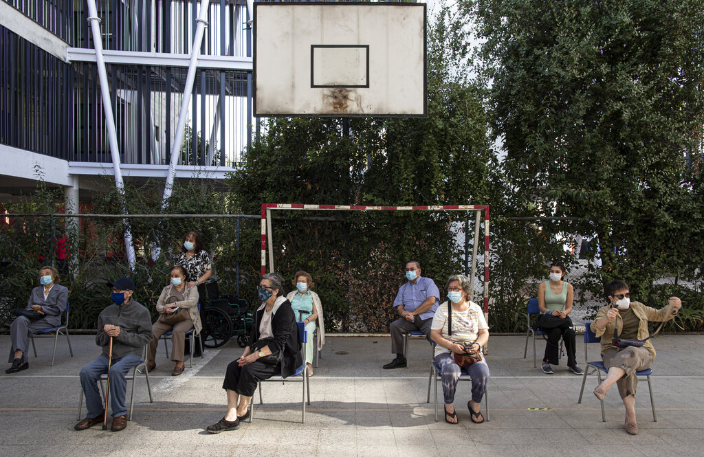 Guardando la distancia social y con mascarilla para protegerse del coronavirus, un grupo de personas espera para recibir la segunda dosis de la vacuna de Sinovac en la escuela pública Carmela Carvajal en Santiago, Chile, el 3 de marzo de 2021. (AP Foto/Esteban Félix)