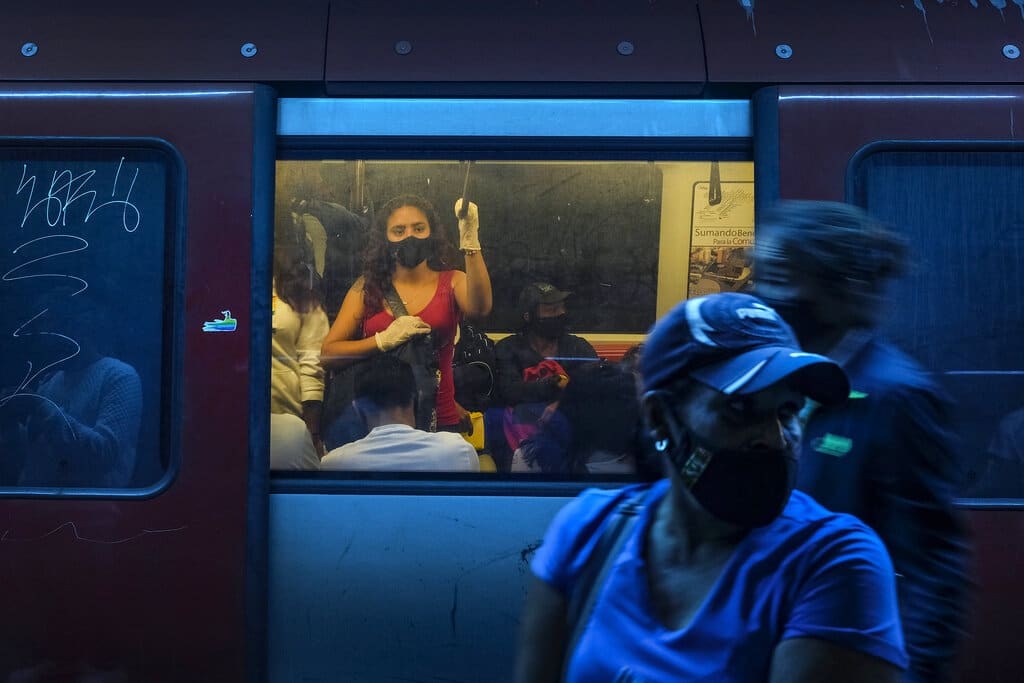 Pasajeros, con mascarilla por la pandemia del coronavirus, viajan en metro, en Caracas, Venezuela, el 2 de marzo de 2021. Tras un alza el año pasado, el gobierno venezolano ordenó una nueva subida del boleto de metro, que pasará a costar 20.000 bolívares por trayecto, el equivalente a un centavo de dólar. (AP Foto/Matías Delacroix)
