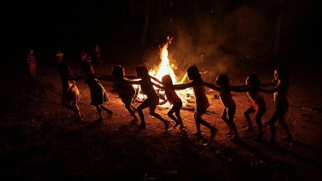 Niños de la tribu brasileña de los Tenetehara juegan alrededor de una fogata durante un festival en la Tierra Indígena Alto Río Guamá, donde aplicaron un aislamiento obligatorio de seis meses durante la pandemia de coronavirus, cerca de la ciudad de Paragominas, Brasil, el lunes 7 de septiembre de 2020. Los indígenas, también llamados Tembé, celebran que nadie de su tierra se ha enfermado de COVID-19. (AP Foto/Eraldo Peres)