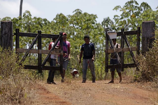 Hombres indígenas Tenetehara Ronilson Seleiro Tembe, centro, y Regis Tufo Moreira Tembe, derecha, abren una puerta que conduce al Territorio Indígena Alto Río Guama, cerca de Paragominas, estado de Pará, región norte de Brasil, el lunes 7 de septiembre de 2020. (Foto AP / Eraldo Peres)