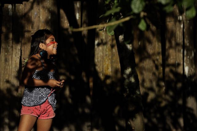 La indígena Tenetehara Mayra Muxi Tembe, juega afuera de su casa en el Territorio Indígena Alto Río Guama, cerca de Paragominas, estado de Pará, región norte de Brasil, el lunes 7 de septiembre de 2020 (AP Photo / Eraldo Peres)