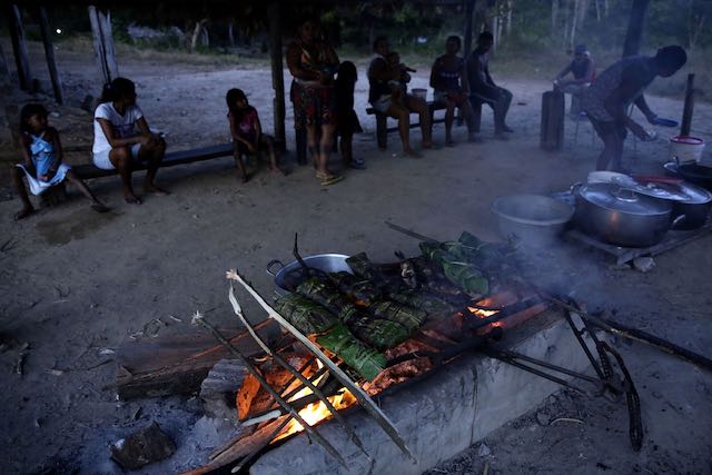 Mujeres indígenas Tenetehara asan pescado durante un festival en la Reserva Indígena Alto Río Guama, cerca de Paragominas, estado de Pará, Brasil, el lunes 7 de septiembre de 2020 (AP Photo / Eraldo Peres)