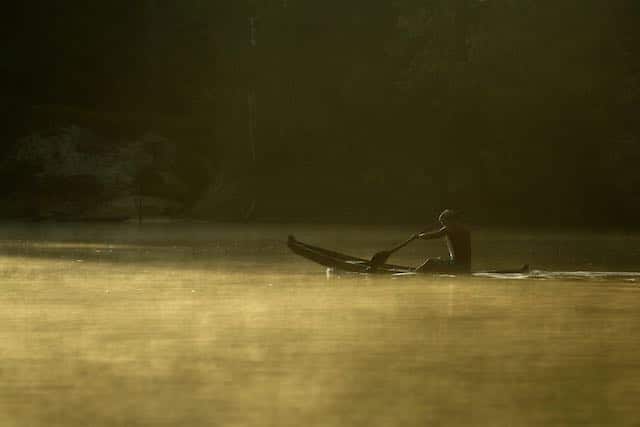 Un indígena Tenetehara rema su canoa en el río Gurupi, en el territorio indígena Alto Río Guama, cerca de Paragominas, estado de Pará, región norte de Brasil, el lunes 7 de septiembre de 2020 (Foto AP / Eraldo Peres)