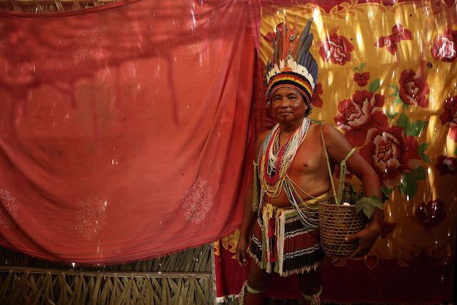 El chamán indígena Tenetehara Paulo Sergio Tembe, de 50 años, posa para una foto en su casa con la canasta de raíces de la medicina tradicional, en el territorio indígena Alto Río Guama, cerca de Paragominas, estado de Pará, región norte de Brasil, el lunes 7 de septiembre. 2020. (Foto AP / Eraldo Peres)