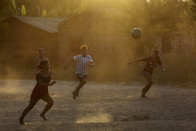 Jóvenes indígenas Tenetehara juegan a la pelota al atardecer en la Reserva Indígena Alto Río Guama, cerca de Paragominas, Brasil, el lunes 7 de septiembre de 2020 (AP Photo / Eraldo Peres)