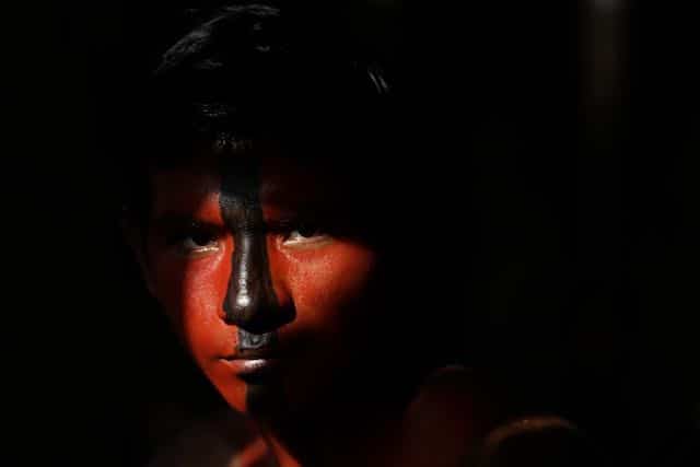 El indígena Tenetehara Jair Tembe participa en un festival en el Territorio Indígena Alto Río Guama, cerca de la ciudad de Paragominas, estado de Para, Brasil, el lunes 7 de septiembre de 2020. (Foto AP / Eraldo Peres)