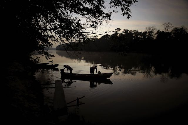 Hombres indígenas Tenetehara se preparan para salir en su bote en el río Gurupi, en el territorio indígena Alto Río Guama, cerca de Paragominas, estado de Pará, región norte de Brasil, el lunes 7 de septiembre de 2020 (AP Photo / Eraldo Peres)