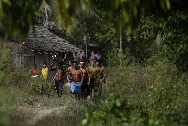 Miembros del indígena Tenetehara llegan para participar en un festival en la Reserva Indígena Alto Río Guama, cerca de Paragominas, estado de Pará, Brasil, el lunes 7 de septiembre de 2020. (Foto AP / Eraldo Peres)