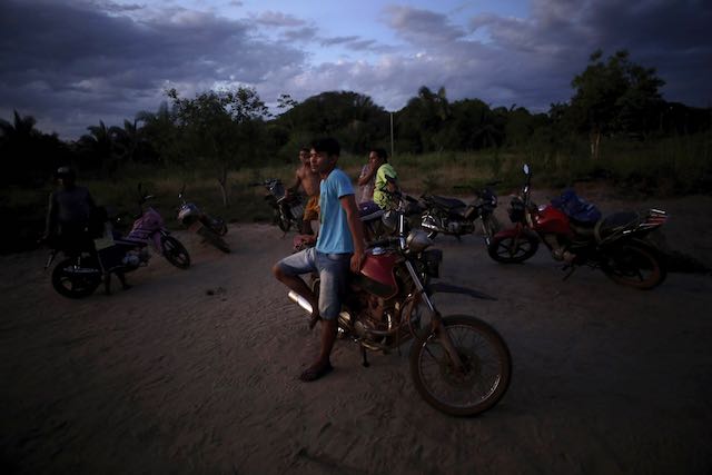 Hombres indígenas Tenetehara se reúnen con sus motocicletas al anochecer en el Territorio Indígena Alto Río Guama, cerca de Paragominas, estado de Para, región norte de Brasil, el lunes 7 de septiembre de 2020 (Foto AP / Eraldo Peres)
