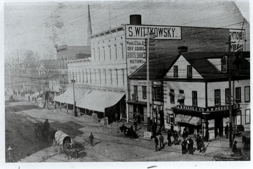Tienda de productos secos de Samuel Wittkowsky. En esta foto de 1890, también puede ver los pilares del Palacio de Justicia en las calles Trade and Church y la aguja de la Primera Iglesia Presbiteriana. (Imagen: Jewish Historical Society of Greater Charlotte located at the Levine-Sklut Judaic Library and Resource Center)