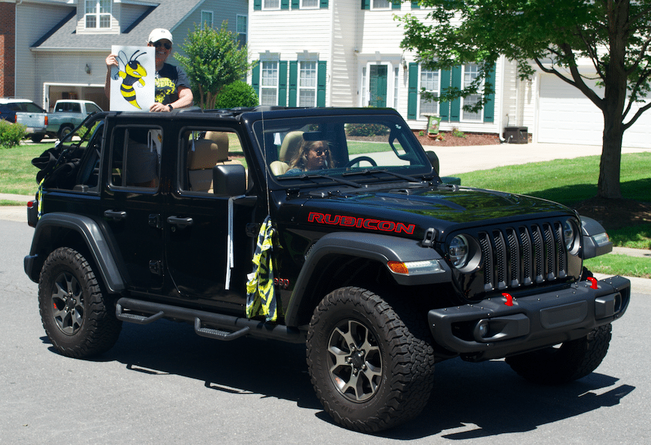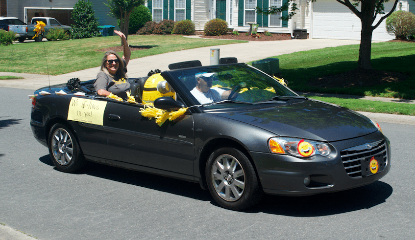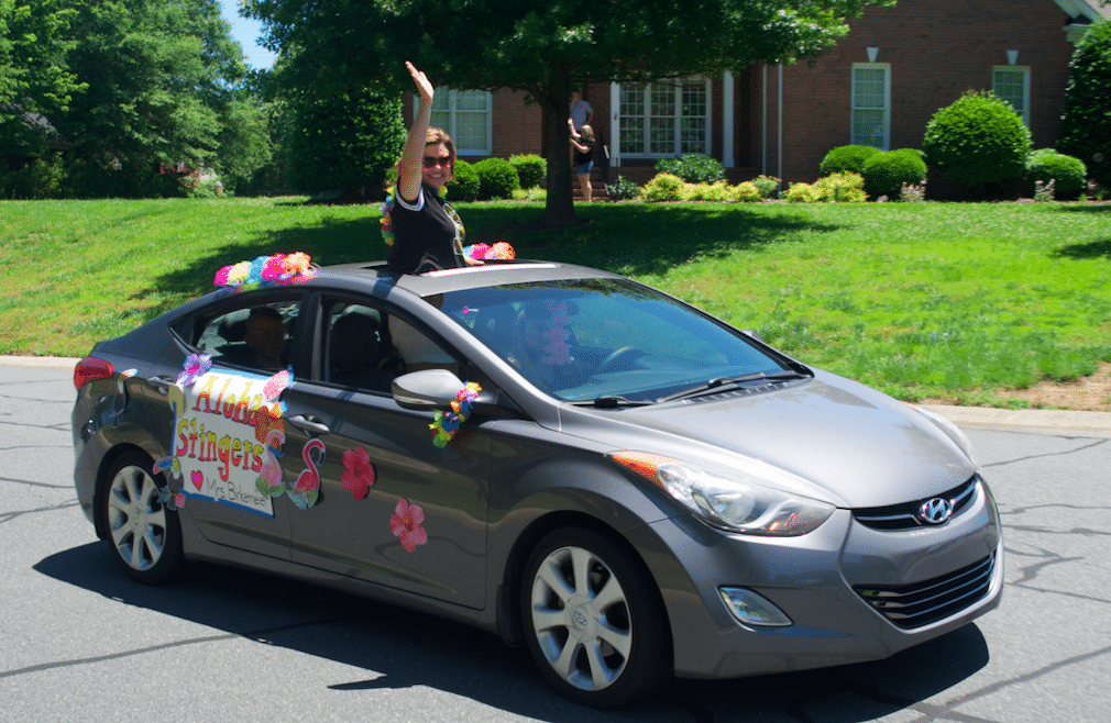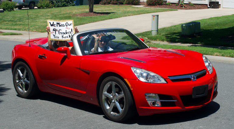 Los maestros decoraron sus carros y condujeron por los vecindarios. Los estudiantes y sus familias se sentaron afuera de sus hogares con carteles para ver los maestros.