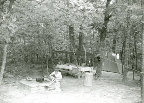 La familia H. H. Moore de Greensboro, N.C., disfruta de acampar en tiendas de campaña en el parque, en 1959. (Imagen: North Carolina, Division of State Parks)