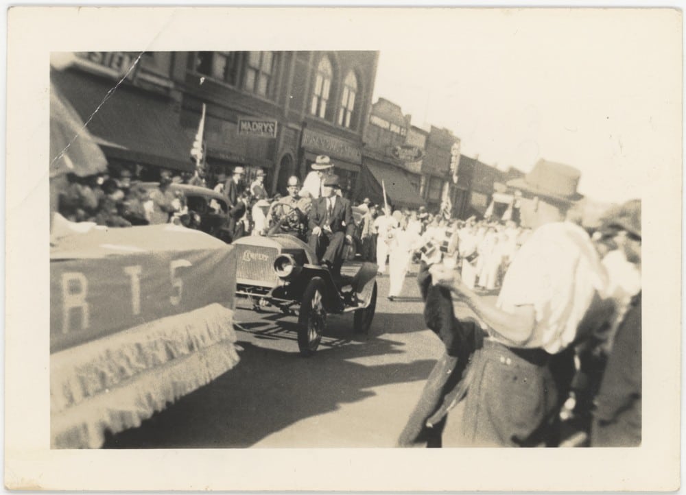 Spider Clark manejaba el antiguo auto "Lambert". Pasajeros Mack Johnson, Claude Ethridge, 1928. (Imagen: Braswell Memorial Library)