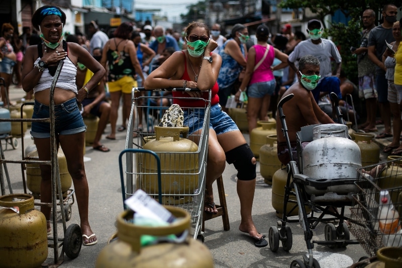 arias personas, con mascarilla por la pandemia del coronavirus, esperan para comprar gas de cocina a bajo precio del Sindicato de Petroleros de Petrobrás, en la favela Vila Vintem de Río de Janeiro. (Foto: AP)