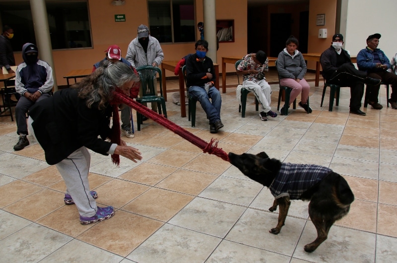 Una mujer juega con un perro mientras espera al almuerzo gratuito que reparte el albergue del Patronato San José, en Quito, Ecuador. (Foto: AP)
