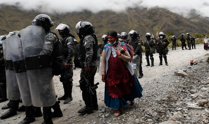 Una mujer pasa junto a efectivos de la policía luego de dispersar una protesta de cultivadores de coca contra el gobierno de Luis Arce, en Unduavi, Bolivia. (Foto: AP)