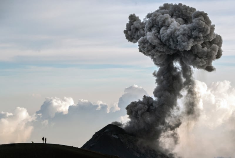 Dos personas observan la erupción del Volcán de Fuego desde la cima del de Acatenango, en Acatenango, Guatemala. (Foto: AP)