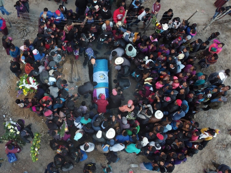Varias personas meten los restos mortales de Elfego Miranda Díaz, uno de los migrantes guatemaltecos asesinado en la frontera entre México y Estados Unidos en enero, en una tumba en un cementerio en Comitancillo, Guatemala. (Foto: AP)