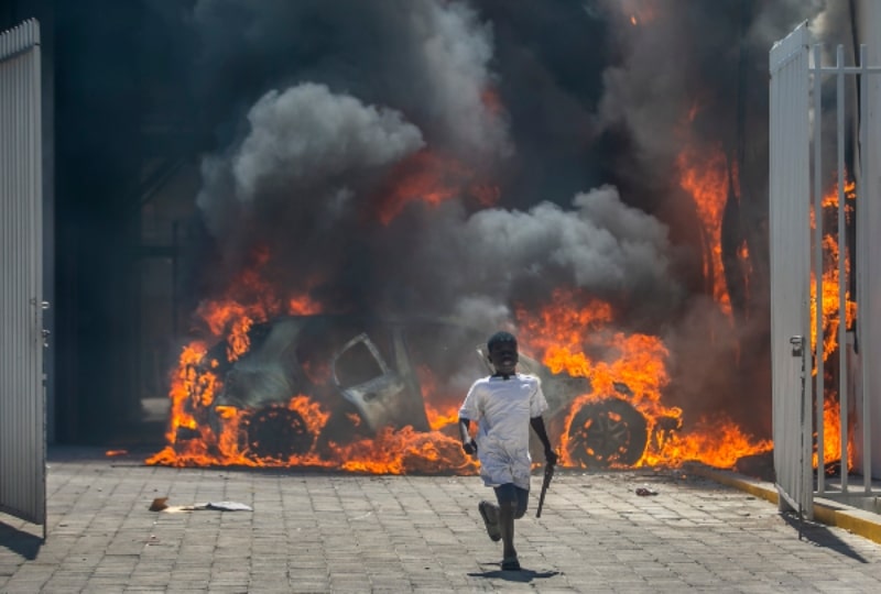 Un niño se aleja corriendo de una tienda de autos Nissan incendiada durante una protesta de una parte de la fuerza policial conocida como Fantom 509, en Puerto Príncipe, Haití. (Foto: AP)
