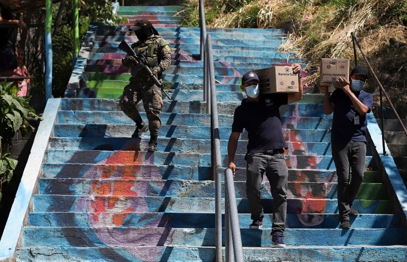 Un soldado escolta a voluntarios que reparten cajas de comida donada a personas afectadas por la pandemia del coronavirus, en San Salvador, El Salvador. (Foto: AP)