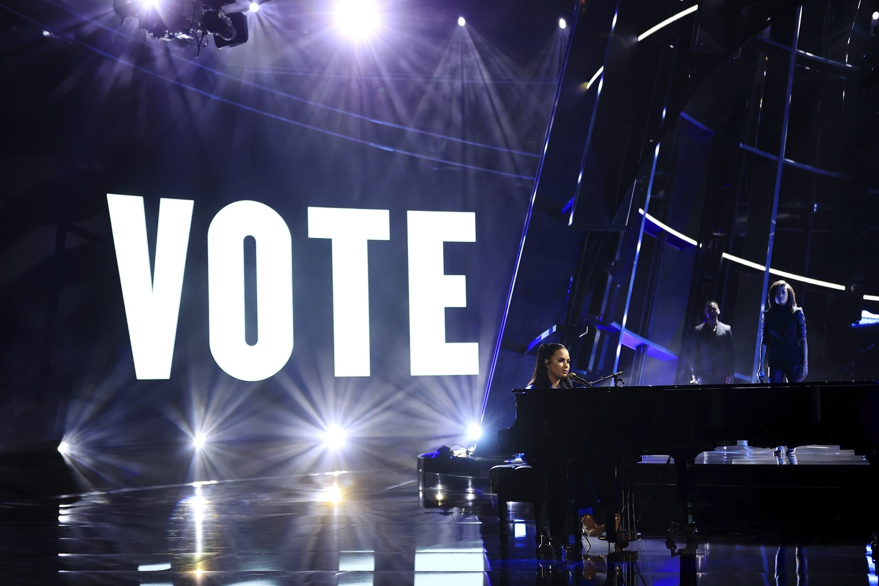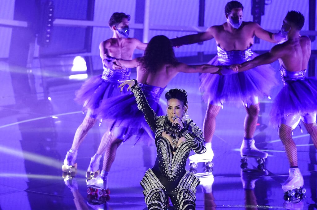 En esta imagen difundida por NBC, Demi Lovato interpreta "Commander in Chief" en la ceremonia de los Premios Billboard de la Música el miércoles 14 de octubre del 2020 en el Teatro Dolby, en Los Angeles. (Christopher Polk/NBC via AP)