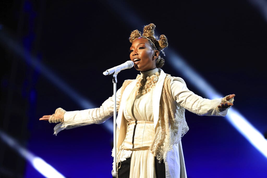 En esta imagen difundida por NBC, Brandy canta durante la ceremonia de los Premios Billboard de la Música, el miércoles 14 de octubre del 2020 en el Teatro Dolby en Los Ángeles. (Christopher Polk/NBC via AP)