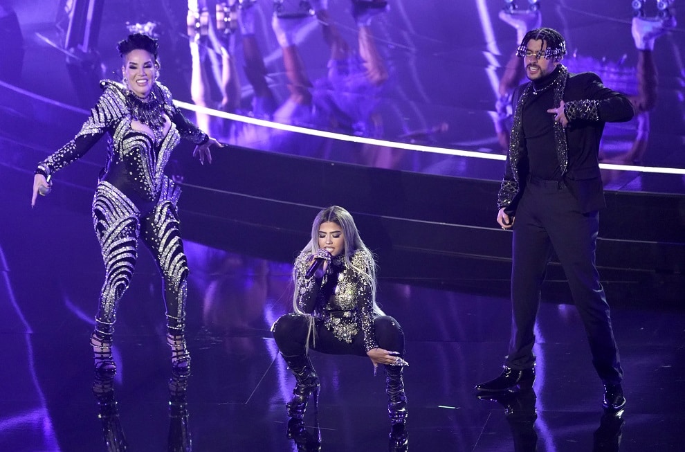 Ivy Queen, a la izquierda, Nesi y Bad Bunny interpretan "Yo perreo sola" en la ceremonia de los Premios Billboard de la Música, el miércoles 14 de octubre del 2020 en el Teatro Dolby en Los Ángeles. (AP Foto/Chris Pizzello)