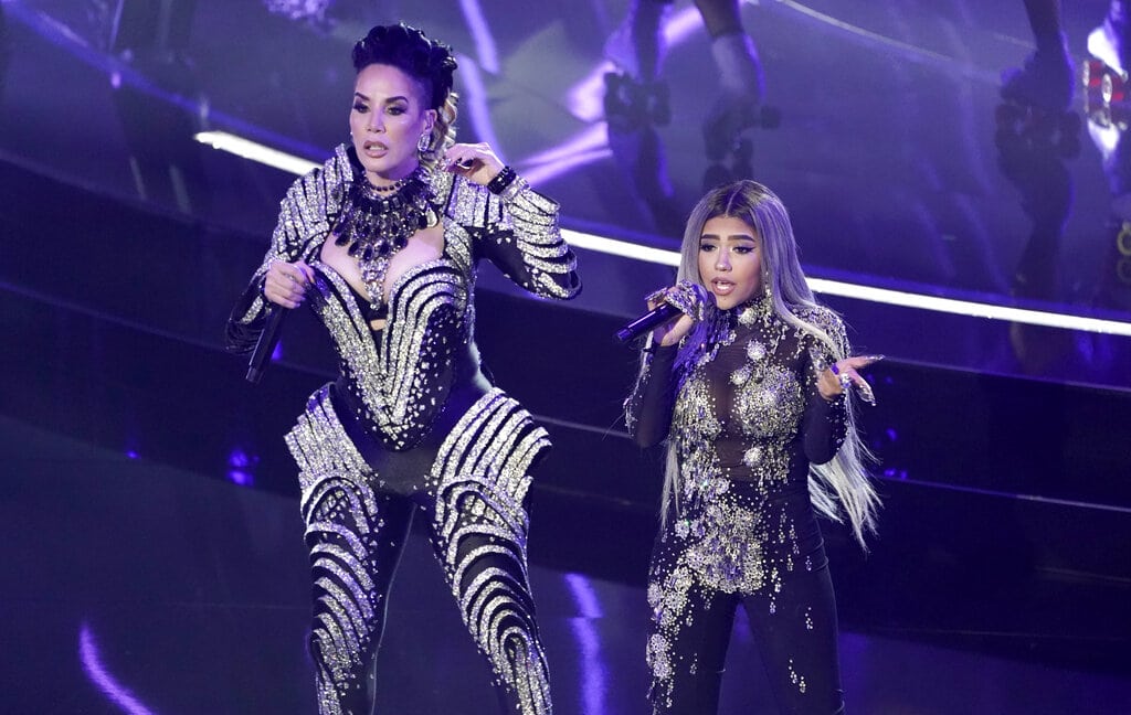 Ivy Queen, a la izquierda, y Nesi interpretan "Yo perreo sola" en la ceremonia de los Premios Billboard de la Música, el miércoles 14 de octubre del 2020 en el Teatro Dolby en Los Ángeles. (AP Foto/Chris Pizzello)