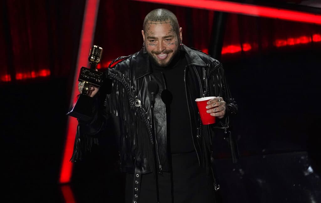 Post Malone recibe el premio al mejor artista en la ceremonia de los Premios Billboard de la Música, el miércoles 14 de octubre del 2020 en el Teatro Dolby en Los Ángeles. (AP Foto/Chris Pizzello)