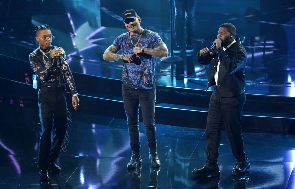 Swae Lee, Kane Brown y Khalid, de izquierda a derecha, interpretan "Be Like That" durante la ceremonia de los Premios Billboard de la Música, el miércoles 14 de octubre del 2020 en el Teatro Dolby en Los Ángeles. (AP Foto/Chris Pizzello)