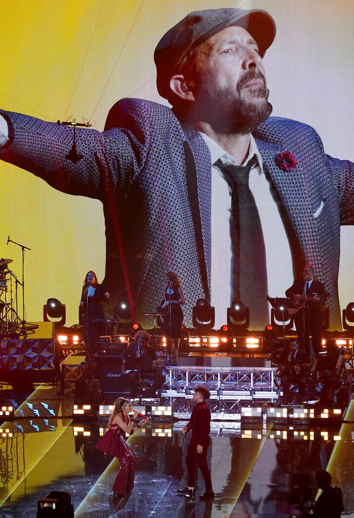Juan Luis Guerra aparece en pantalla mientras Leslie Grace, izquierda, y Prince Royce interpretan un homenaje musical en la 21a entrega anual del Latin Grammy el jueves 19 de noviembre de 2020 en la Arena American Airlines en Miami. (Foto AP/Marta Lavandier)