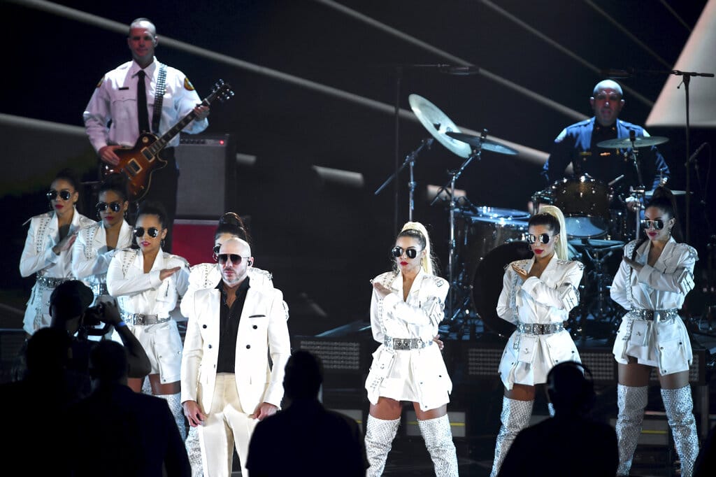 Pitbull durante su presentación con socorristas y trabajadores de salud en la 21a entrega anual del Latin Grammy el jueves 19 de noviembre de 2020 en la Arena American Airlines en Miami. (Foto AP/Taimy Alvarez)
