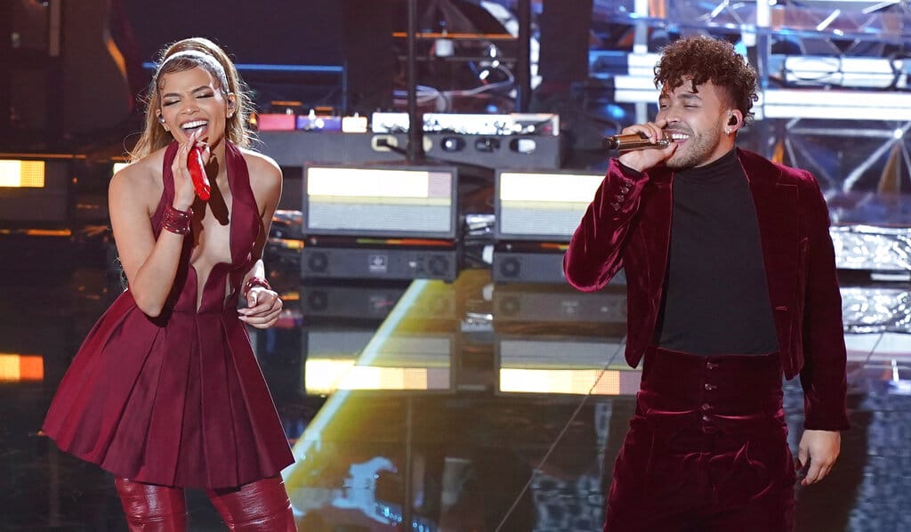 Leslie Grace, izquierda, y Prince Royce durante su presentación en la 21a entrega anual del Latin Grammy el jueves 19 de noviembre de 2020 en la Arena American Airlines en Miami. (Foto AP/Marta Lavandier)