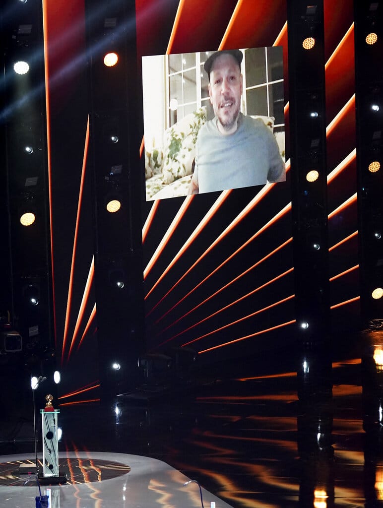 Residente recibe el premio a la canción del año por "René" vía videollamada en la 21a entrega de los Latin Grammy el jueves 19 de noviembre de 2020 en la Arena American Airlines en Miami. (Foto AP Photo/Marta Lavandier)