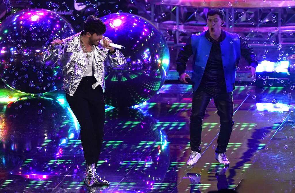 Sebastian Yatra, izquierda, y Guaynaa durante su presentación en la 21a entrega anual del Latin Grammy el jueves 19 de noviembre de 2020 en la Arena American Airlines en Miami. (Foto AP/Marta Lavandier)