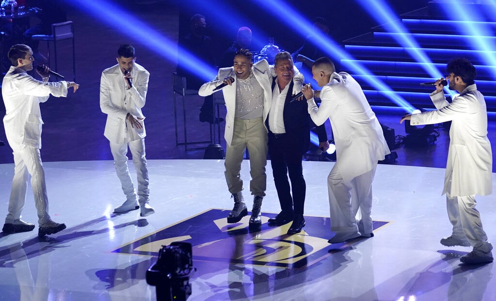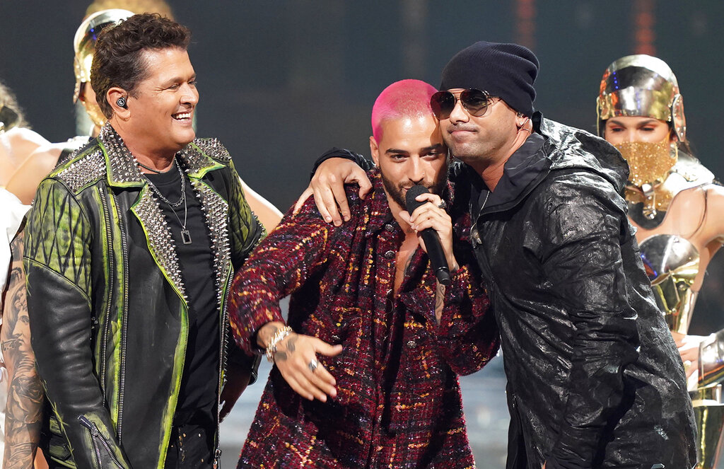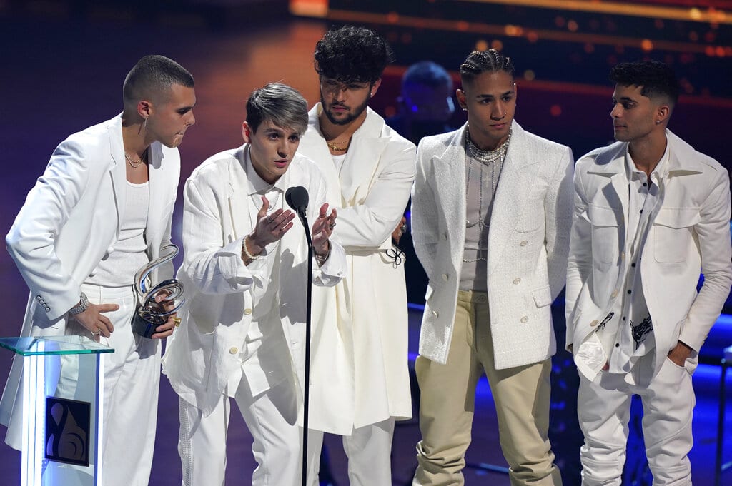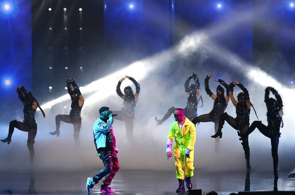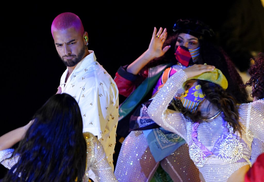 De izquierda a derecha, Mau y Ricky, Ricardo Montaner, Evaluna y Camilo interpretan "Amén" para el Premio Lo Nuestro en el American Airlines Arena en Miami el domingo 14 de febrero de 2021. La ceremonia se transmitió el jueves con una combinación de actuaciones en vivo y pregrabadas. (AP Foto/Jim Rassol)