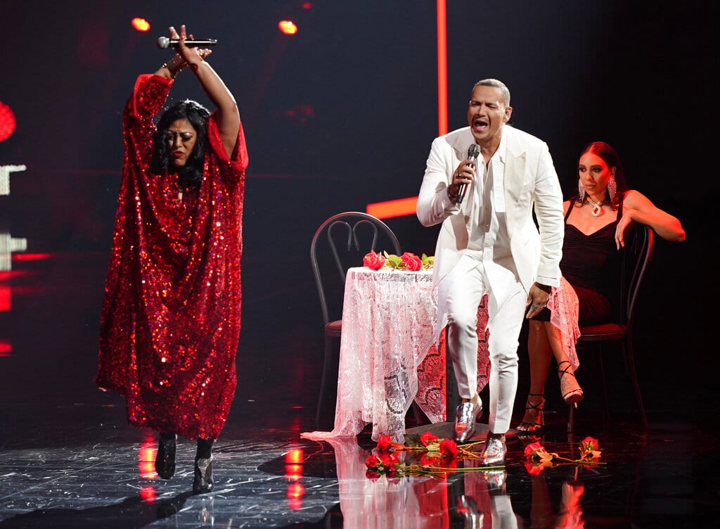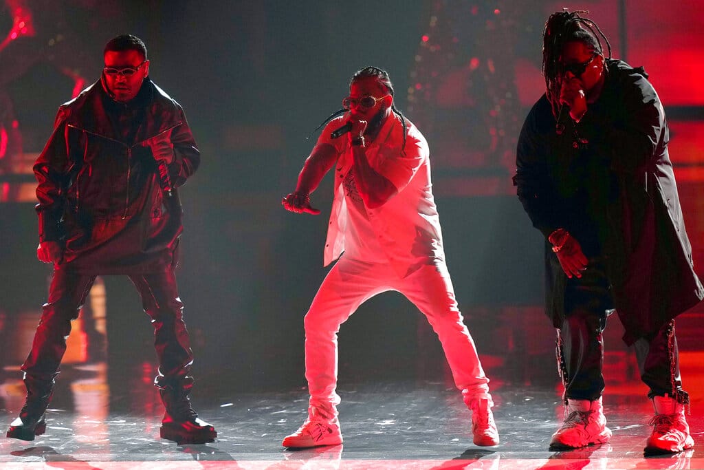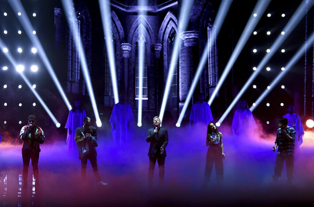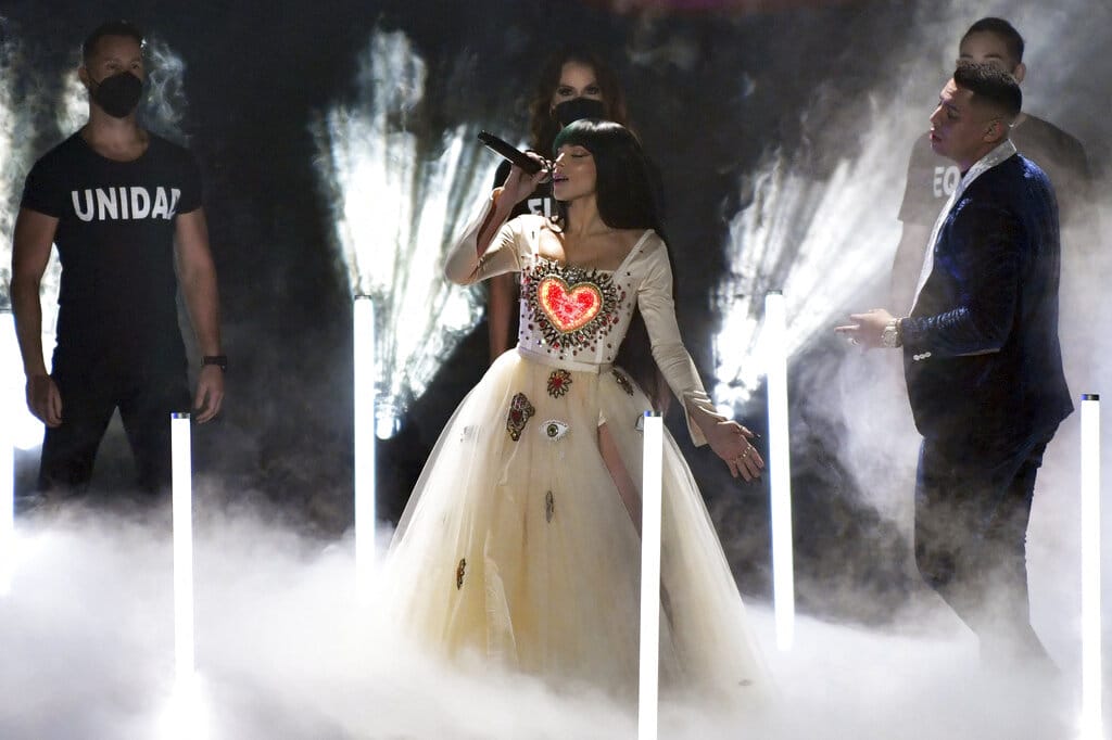 De izquierda a derecha, Mau y Ricky, Ricardo Montaner, Evaluna y Camilo interpretan "Amén" para el Premio Lo Nuestro en el American Airlines Arena en Miami el domingo 14 de febrero de 2021. La ceremonia se transmitió el jueves con una combinación de actuaciones en vivo y pregrabadas. (AP Foto/Jim Rassol)